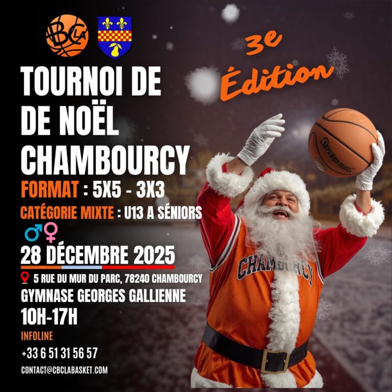 La 3e édition du Tournoi de Noël de Chambourcy arrive pour enflammer votre fin d’année ! Rendez-vous le Samedi 28 Décembre 2025 au Gymnase Georges Gallienne pour une journée de pur basket. Choisissez votre défi : 5×5 classique ou 3×3 explosif, ouvert à toutes les catégories mixtes de U13 à SÉNIORS. Ne manquez pas cette ambiance festive et compétitive de 10h à 17h ! Inscrivez-vous vite pour garantir votre place : contactez le +33 6 51 31 56 57